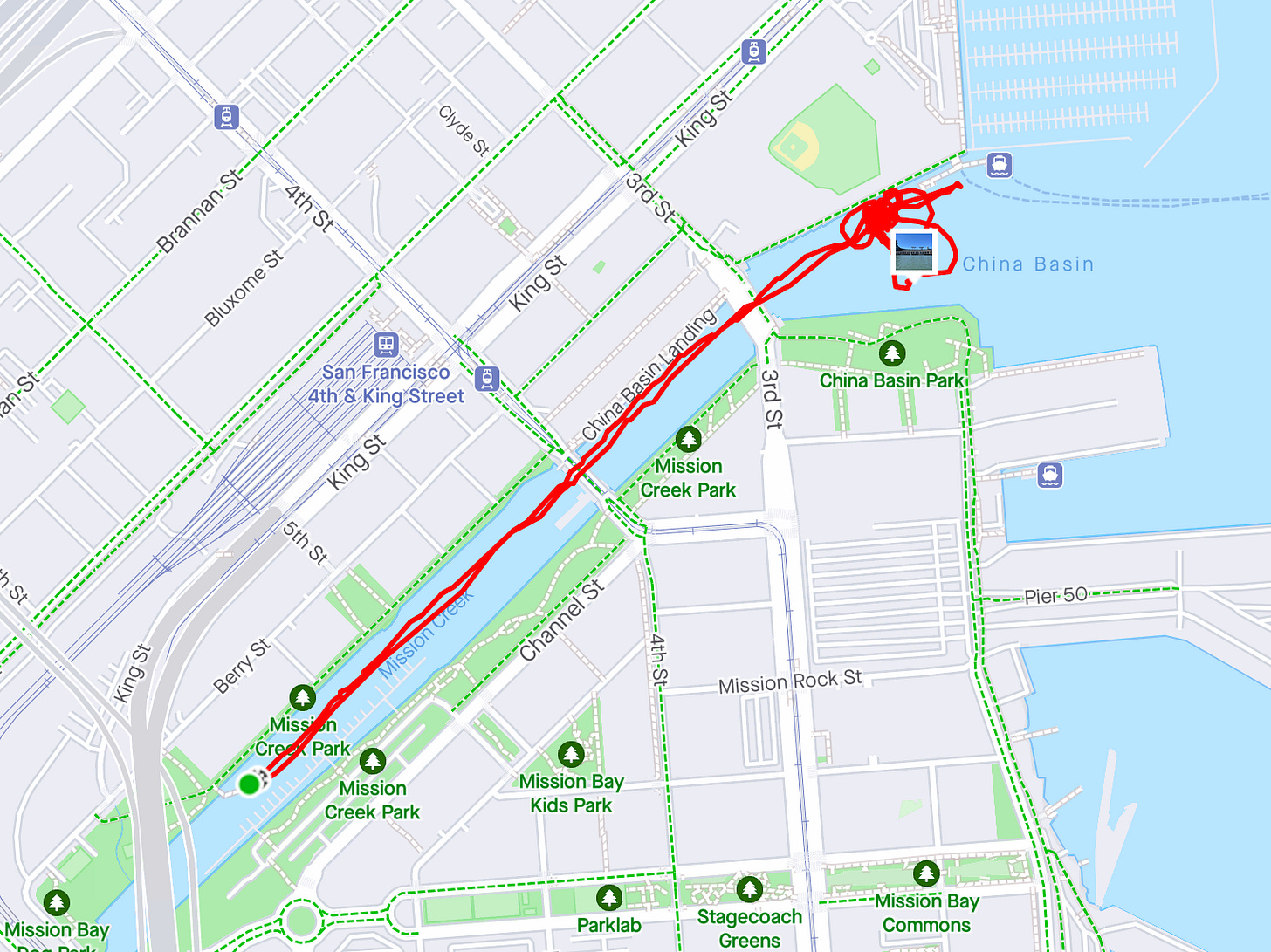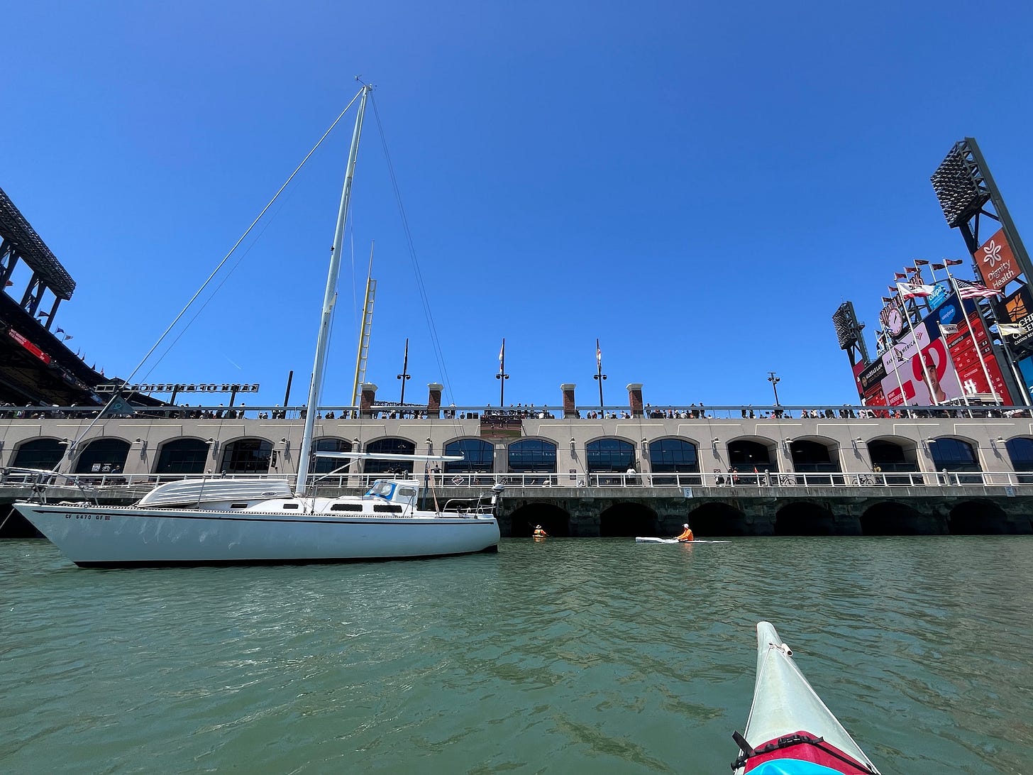 The three of us launched from the public dock on Mission Creek, a few blocks from the ballpark. We’d hoped to put in at Crane Cove, a beach a bit further south, but the forecast was threatening high winds postgame so we opted for a shorter paddle. And the paddle we got was hilariously short—under ten minutes from launch to the ballpark. That, combined with two-ish hours of doodling around in the Cove makes for an amusing Strava track but not much of an expedition.