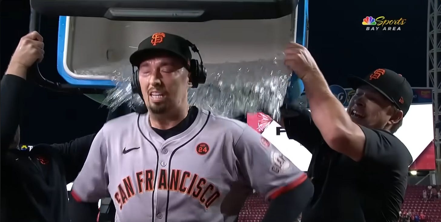 Here’s where things stand: our favored franchise remains 4.5 games out of the playoffs, needing to jump four others in 40-odd remaining games to make the postseason. That’s the bar for success this season. It’s not likely to happen, as most of their competitors brought in additional talent at the trade deadline while the Giants stood pat.1 The weaknesses and weirdnesses that plagued this team two weeks ago remain very much in effect, and were we having this conversation in the not-so-distant era of two wild card teams instead of three, there would be little cause for hope at all. In two weeks, the Giants have ascended from embarrassment to mere mediocrity, and another two weeks could see it all undone. (I tell myself this as much as I tell you this.) That’s the rational perspective.